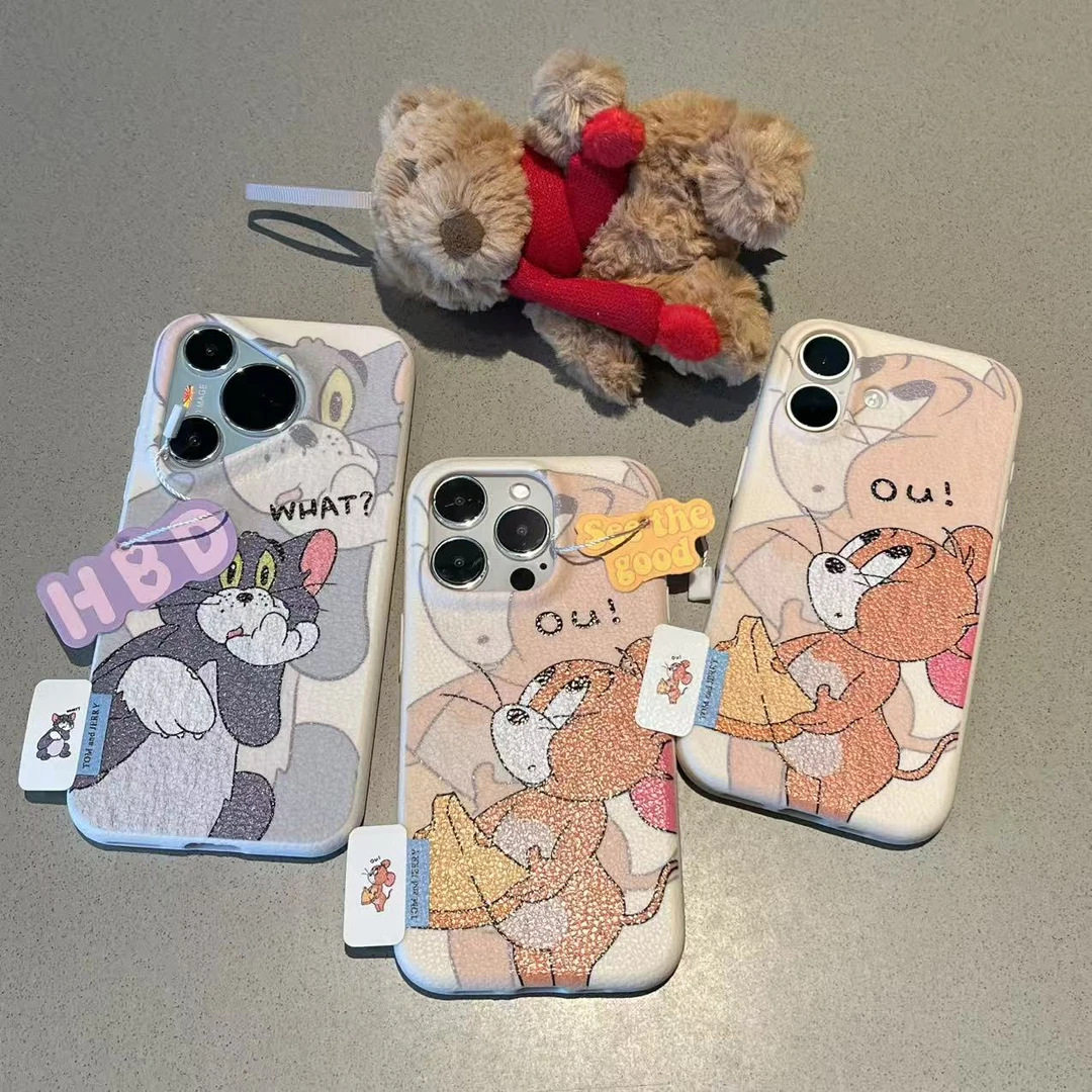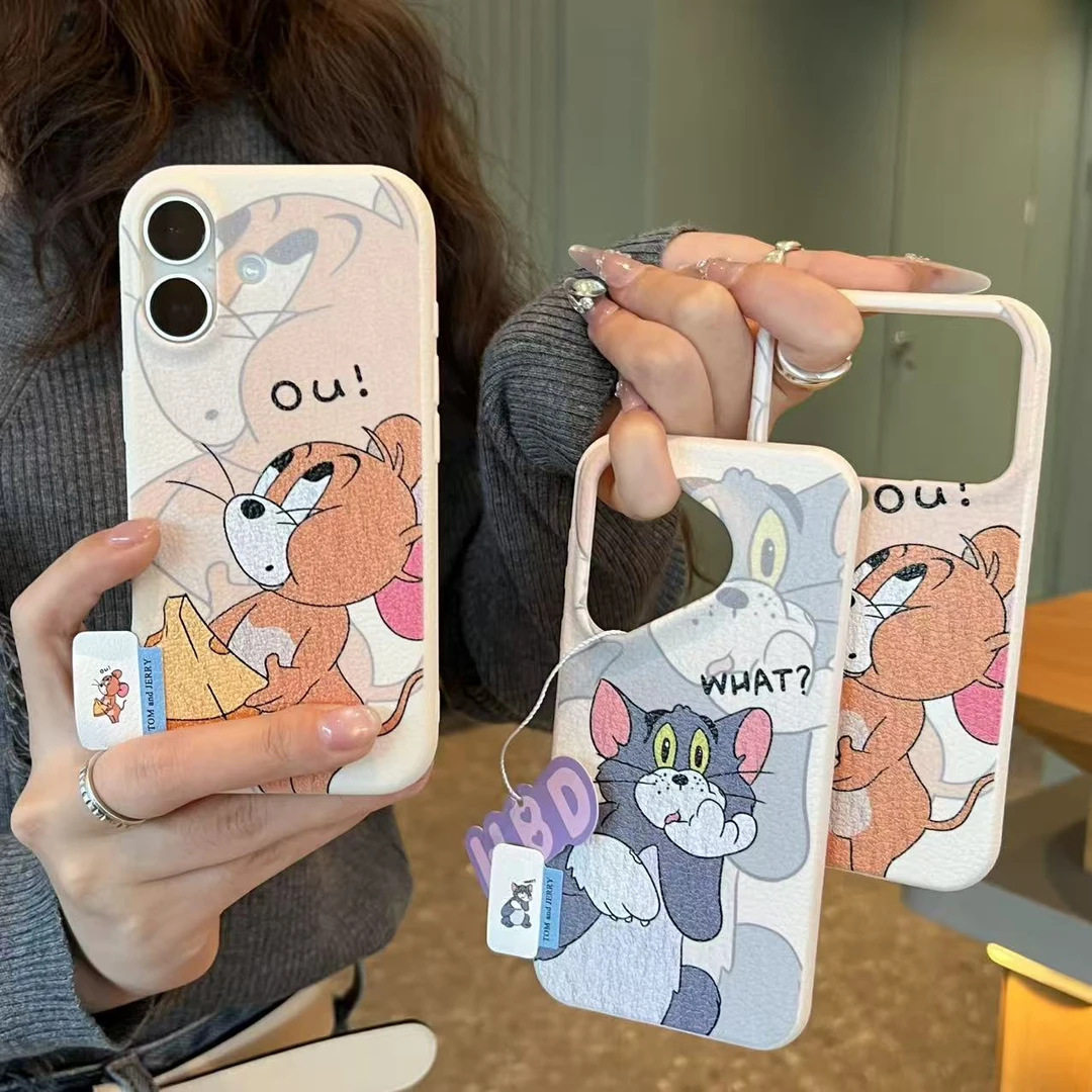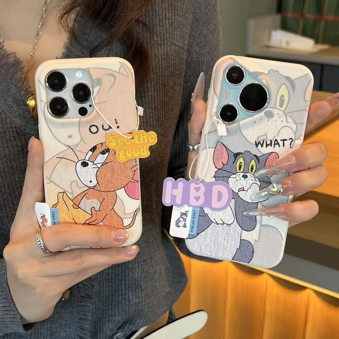 Cute Cat and Mouse Leather Label Suitable for Apple 17Promax Mobile Phone Case Ip16 Couple 15 Large Holes 14 Soft