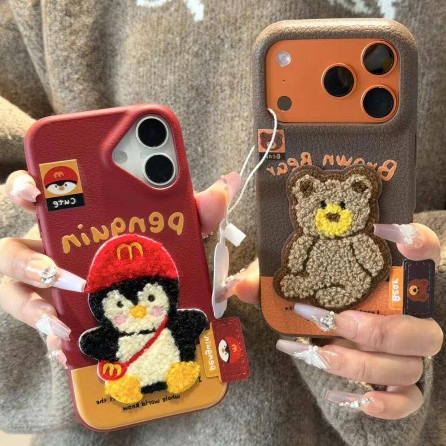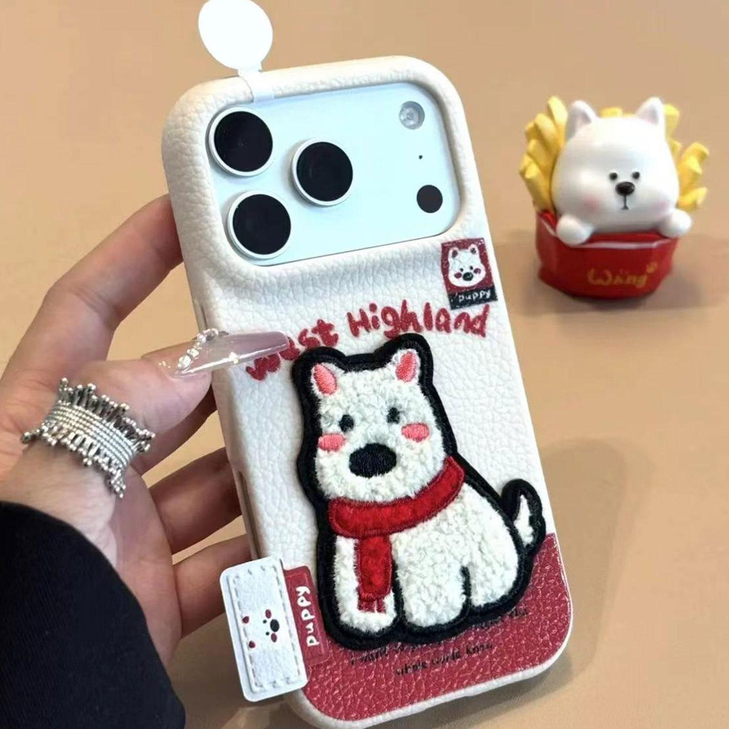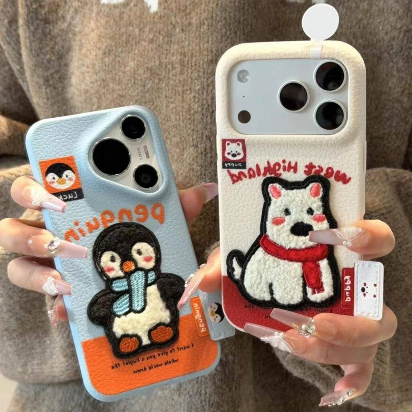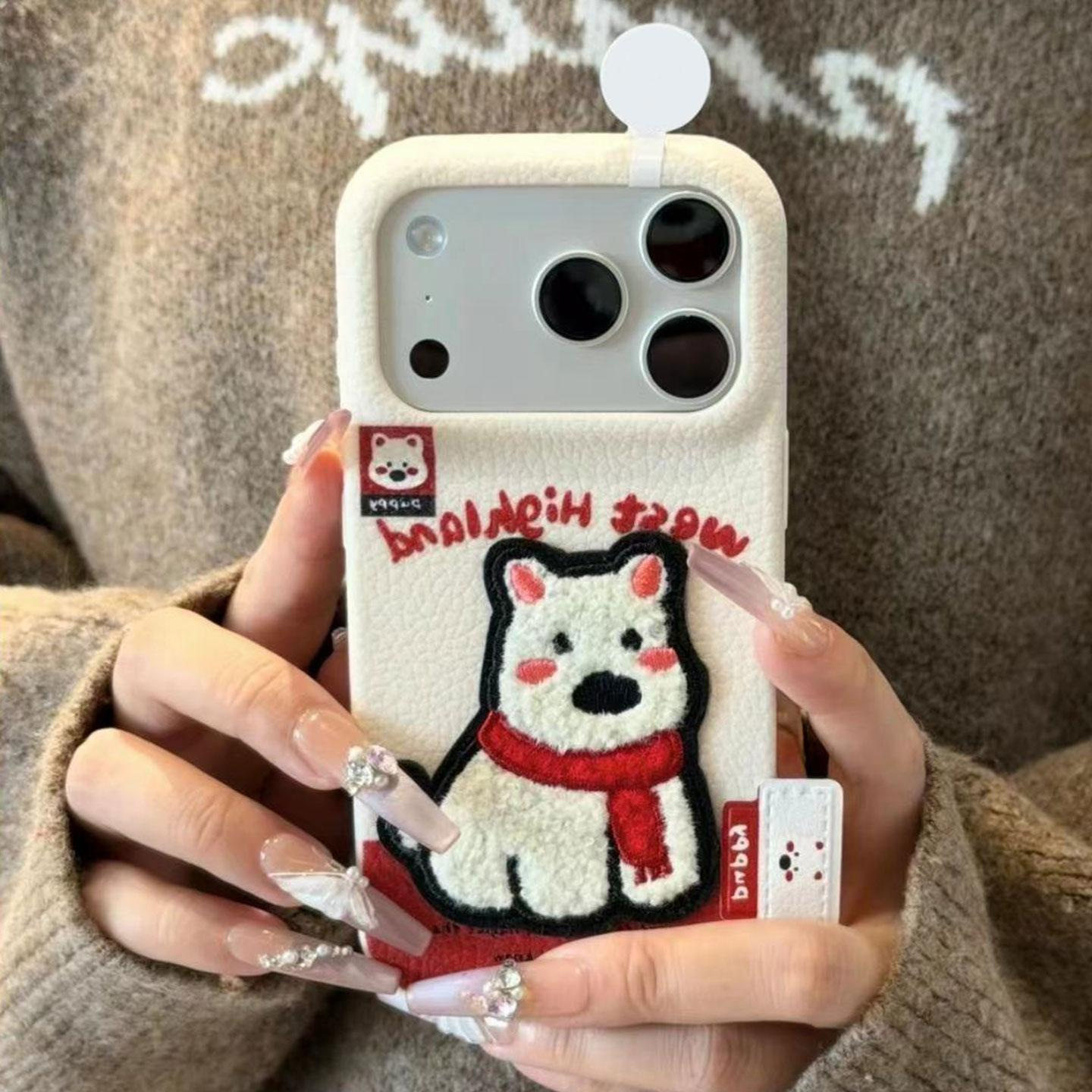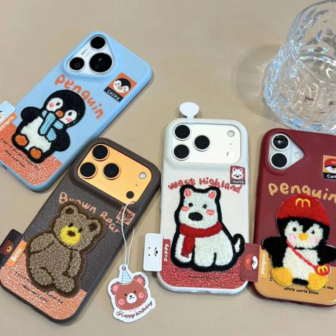 Embroidered Penguin West Highland Bear Label Suitable for Apple 16/17Promax Mobile Phone Case Ip15 Leather Texture 14Pro Female