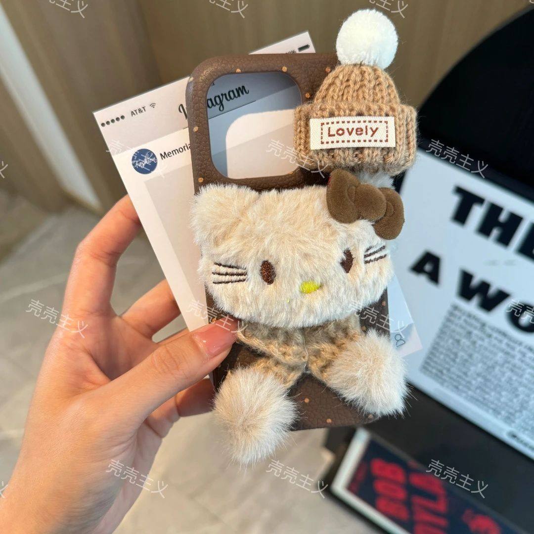 Large hole imitation leather-brown-a481 brown dots + plush hat kt cat-single shell / Apple 16